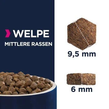 EUKANUBA Trockenfutter-Kroketten sind reich an frischem Huhn und eignen sich perfekt für Welpen mittelgroßer Rassen im Alter von 1 bis 12 Monaten. Mit speziell ausgewählten Zutaten unterstützt das Futter Wachstum und Entwicklung Ihres Welpen. EUKANUBA Trockenfutter enthält DHA für aufgewecktere, lernfähigere Welpen und Kalzium, das die Knochenentwicklung unterstützt. Die speziell abgestimmte Ballaststoffmischung mit dem Präbiotikum FOS, MOS und Rübenschnitzeln fördert eine gesunde Verdauung. Darüber hinaus sorgen EUKANUBA Kroketten mit natürlichen Omega-6- und Omega-3-Quellen für gesunde Haut und ein glänzendes Fell. Zusätzlich helfen die einzigartigen sechseckigen EUKANUBA Kroketten und das Zahnpflegesystem DentaDefense, die Zähne langfristig sauber und gesund zu halten. Das Futter ist 100 % vollwertig und ausgewogen. Eine innovative Rezeptur für Welpen mittelgroßer Rassen zur Unterstützung einer optimalen Körperkondition, damit sich Ihr Hund ein Leben lang wohlfühlt.