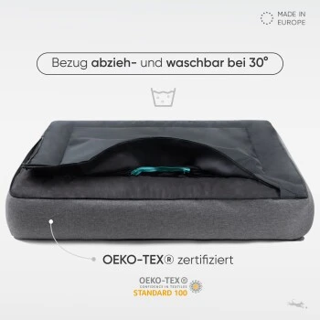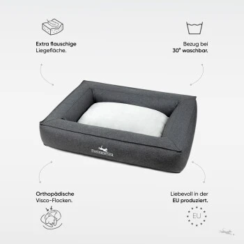 Das orthopädische Hundebett „Siebenschläfer“ im eleganten Box Design ist mit atmungsaktiven & druckentlastenden Memory Foam Flocken gefüllt. Diese passen sich perfekt dem Körper deines Hundes an. Für die Liegefläche haben wir einen kuschelig weichen Stoff verwendet, der aber kurz genug ist, um Schmutz bestmöglich abweisen zu können. Der pflegeleichte Bezug ist zu dem bei 30 Grad waschbar. Das Hundebett ist in den folgenden Größen erhältlich: M = 80x60cm, L = 100x70cm & XXL = 120x80cm.