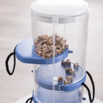 Hunde sind sehr intelligente und wissbegierige Tiere. Sie wollen nicht nur körperlich durch Spiele und Training, sondern auch geistig beschäftigt werden. Mithilfe von Dog Activity Strategiespielen können Sie Ihren Hund immer wieder von neuem fordern und die Bindung zu Ihrem Tier stärken. Der Gambling Tower ist ein Strategiespiel mit dem Schwierigkeitslevel 1 und für Spielanfänger jeglichen Alters geeignet. Die besondere Herausforderung liegt darin, die Einschübe in der richtigen Reihenfolge zu bedienen, damit die Leckerlis nach unten durchfallen und der Hund an seine Belohnung zu gelangt. Um den Turm herum sind drei Kegel platziert unter denen ebenfalls kleine Snacks versteckt werden können. Der Gambling Tower besteht aus Kunststoff und wird mit Übungsheft geliefert.